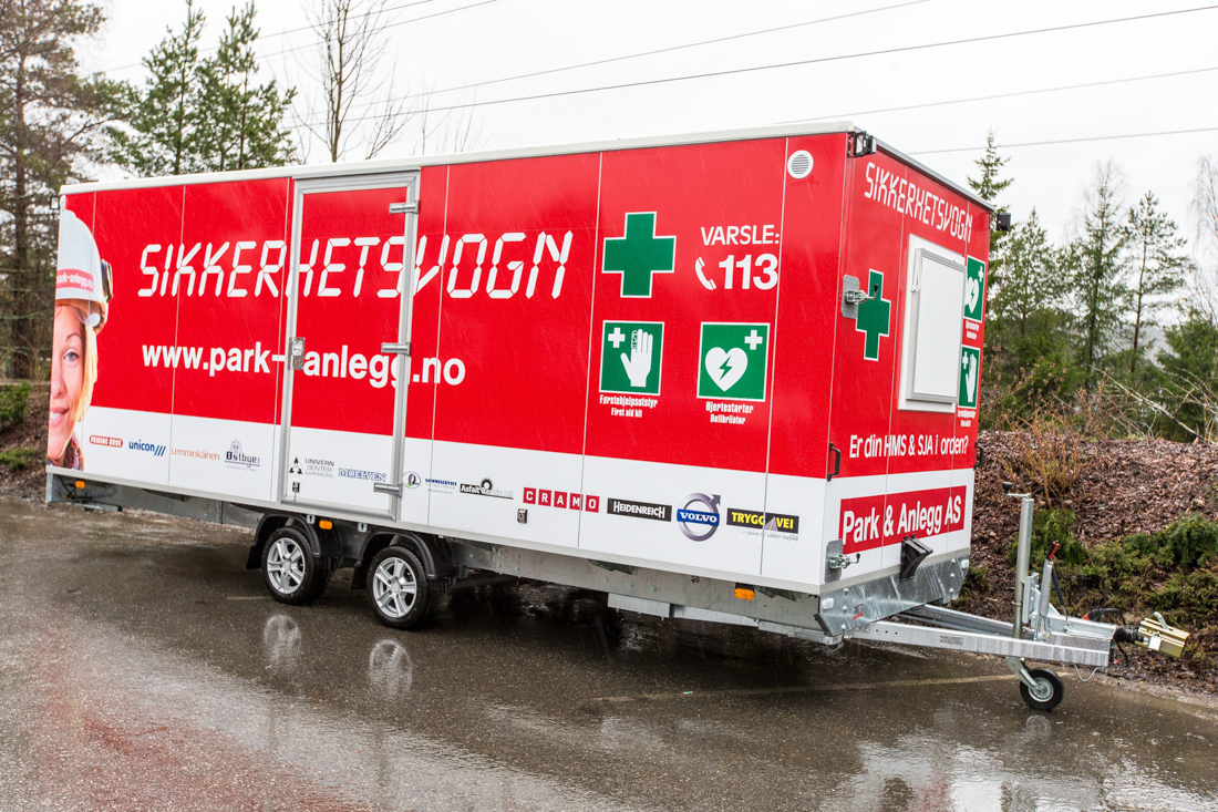 HAFSLUNDØY: Park & Anlegg AS i Sarpsborg er i ferd med å ta i bruk et konkret og synlig hjelpemiddel i HMS-arbeidet: En egenutviklet sikkerhetsvogn som er spesialinnredet for sikker jobb-analyser og sikkerhetsgjennomgang med mannskaper fra HE og UE-er på et anlegg. Vogna har dessuten to sengeplasser, samt hjertestarter og annet førstehjelpsutstyr til å ta vare på skadde dersom uhellet skulle være ute. Primærhensikten her er forebygging av ulykker, ikke behandling av konsekvensene av dem.