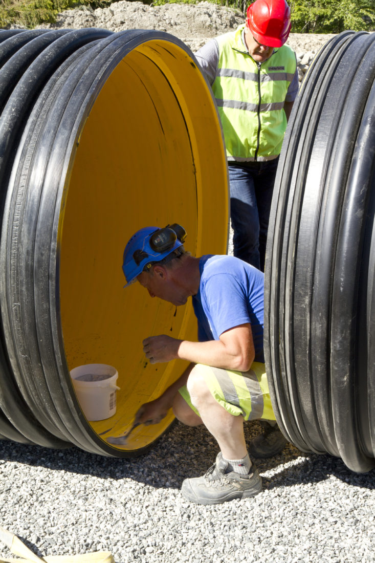 – Dermed måtte flere tanker ha blitt skjøtet sammen, og dette ville gjort installasjonen langt mindre solid enn denne løsningen med XL-rør. Dessuten forblir PE-materialet i disse elastisk ved frost, mens glassfiber gjerne blir sprøtt.