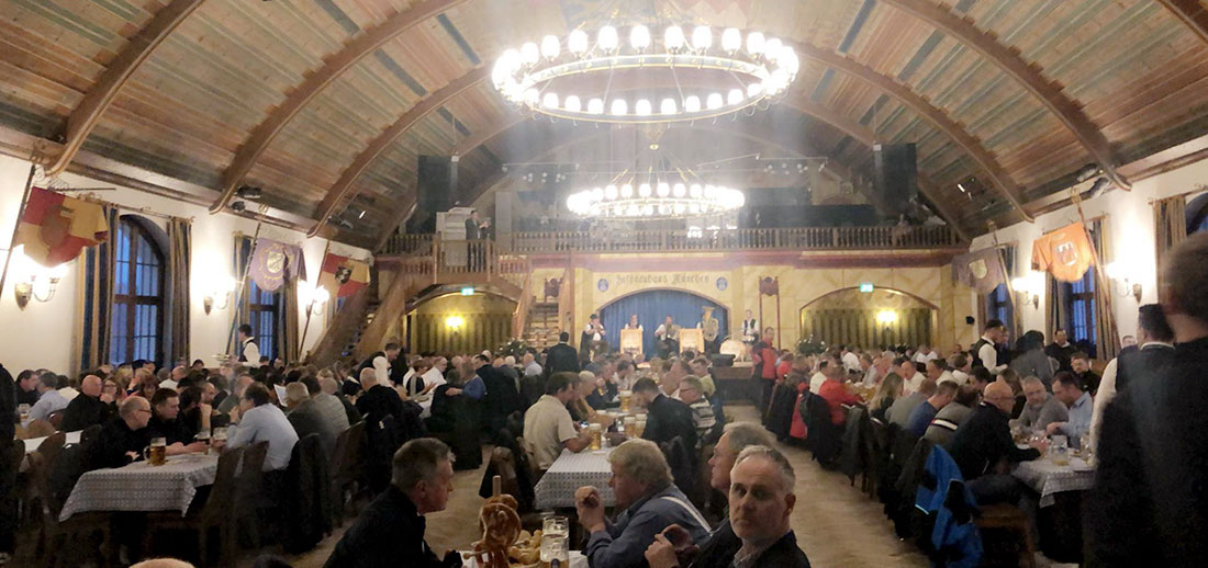 Sosialt samvær med festlige kvelder som godt kan bli litt utpå er en viktig del av tur til messe. Mandag kveld arrangerte MEF en bayersk aften på restauranten Hofbräuhaus i sentrum av München. 170 deltok. Restauranten har en total kapasitet på intet mindre enn 4500 gjester til bords.