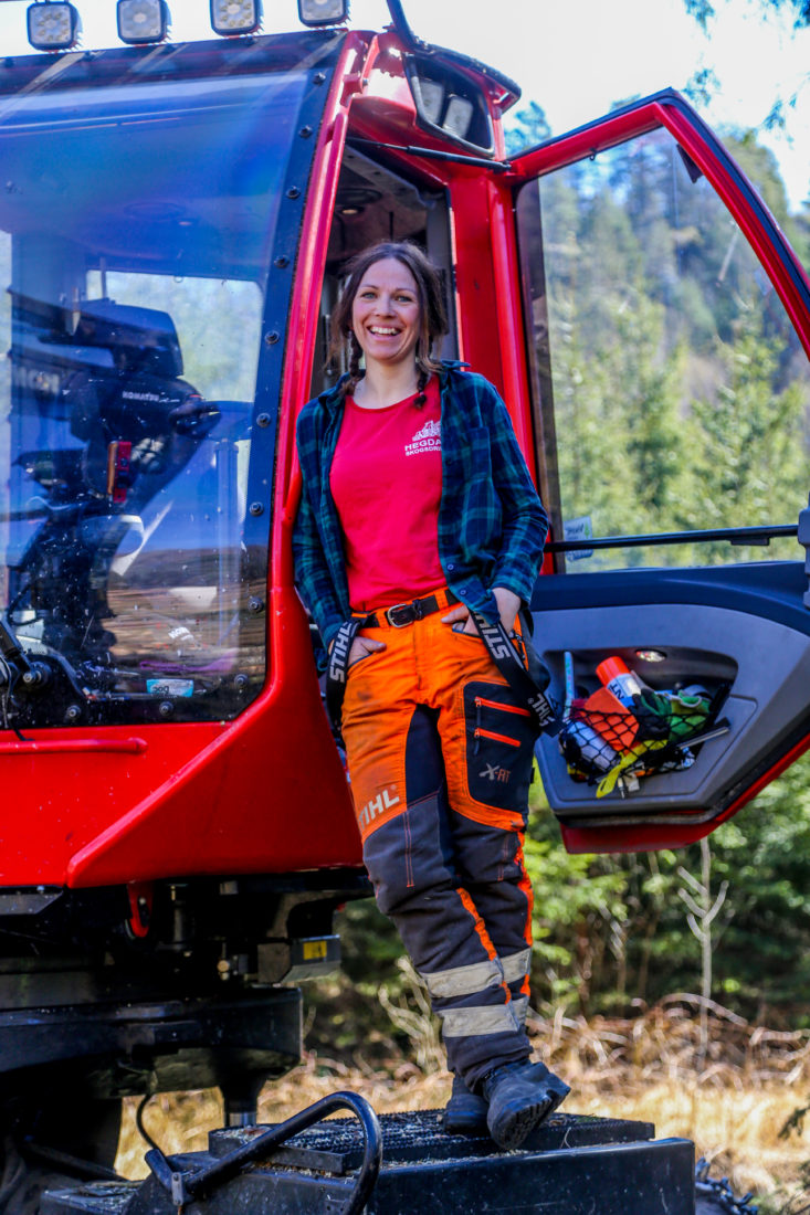 – Av og til må jeg ut og skru eller skifte deler, og rett som det er må jeg ut og felle trær manuelt med motorsag. Mannfolk har vel generelt mer tro på seg selv til slike oppgaver enn vi damer har, men vi får det til vi også. Jeg håper jeg kan være en inspirasjon for andre jenter som har lyst til å gå denne veien. For det er ingenting i veien for at ikke jenter kan gjøre denne jobben like bra som gutta, slår hun fast.