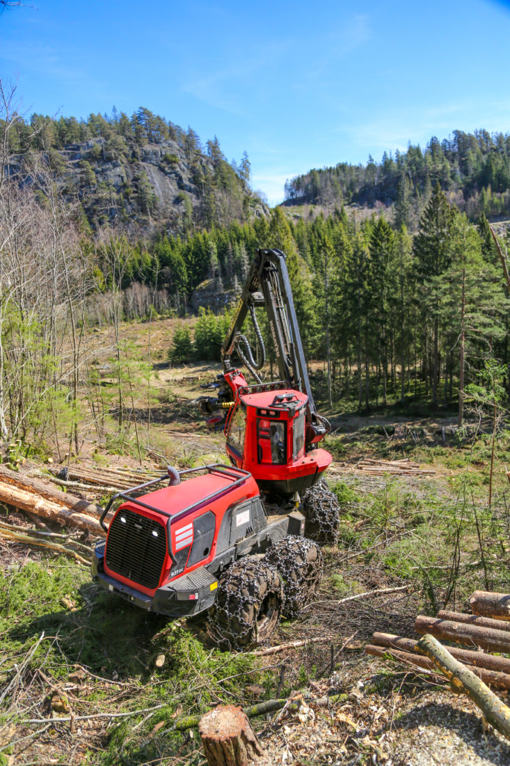 Det er fascinerende å se hvor lekende lett hogstaggregatet feller store trær, kvister dem og kapper dem opp. Linn-Merete er svært dreven etter 17 år, og jobben utføres raskt og effektivt. (Foto: Runar F. Daler).