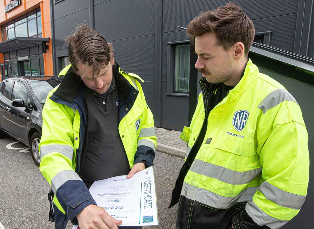 Svart på hvitt: Sertifisering etter ISO 9001 og 14001 er på plass. Prosjektleder Magne Toftevåg og KS-/HMS-leder Brage Søderholm er fornøyd med det.