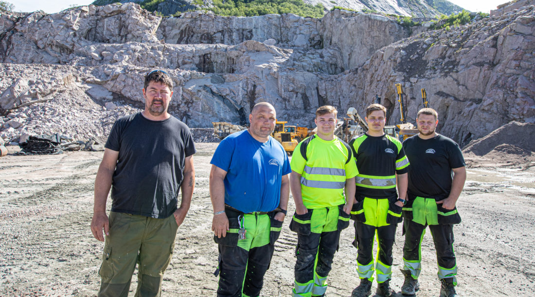 Bruddet i Reipå har vært i drift siden 50-tallet. Reipå Knuseri AS har drevet her siden 80-tallet. F.v. Frank og Timo Svendsgård, Ruben Johansen og Steffen Hansen i Reipå i Reipå Knuseri AS. Tommy Værang helt t.v. fra Kurs og Sikkerhet var på besøk i anledning oppkjøring på maskin. (Foto: Jørn Søderholm).