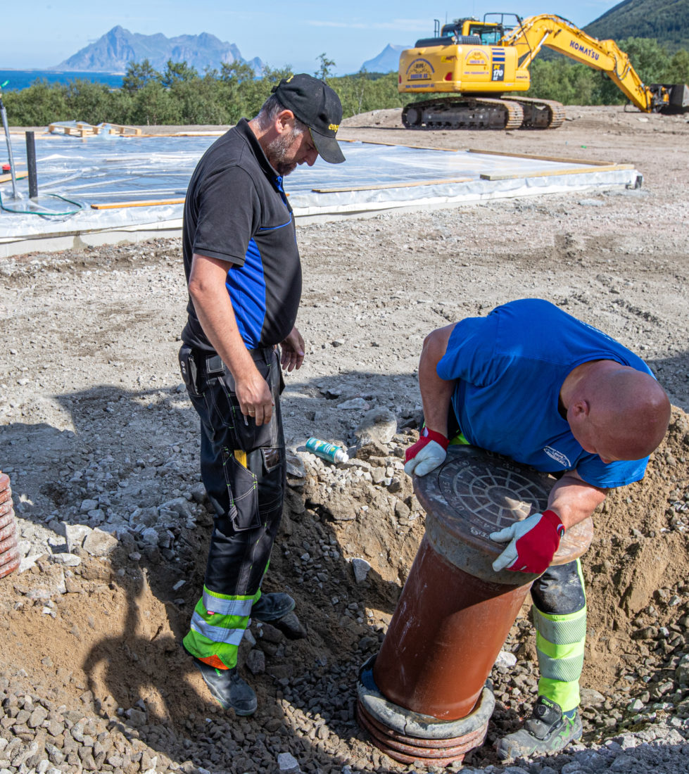 Rørlegger Tormod Martinussen og maskinfører Jan Kenneth Svendsgård i arbeid på en tomt nær Reipå. (Foto: Jørn Søderholm).