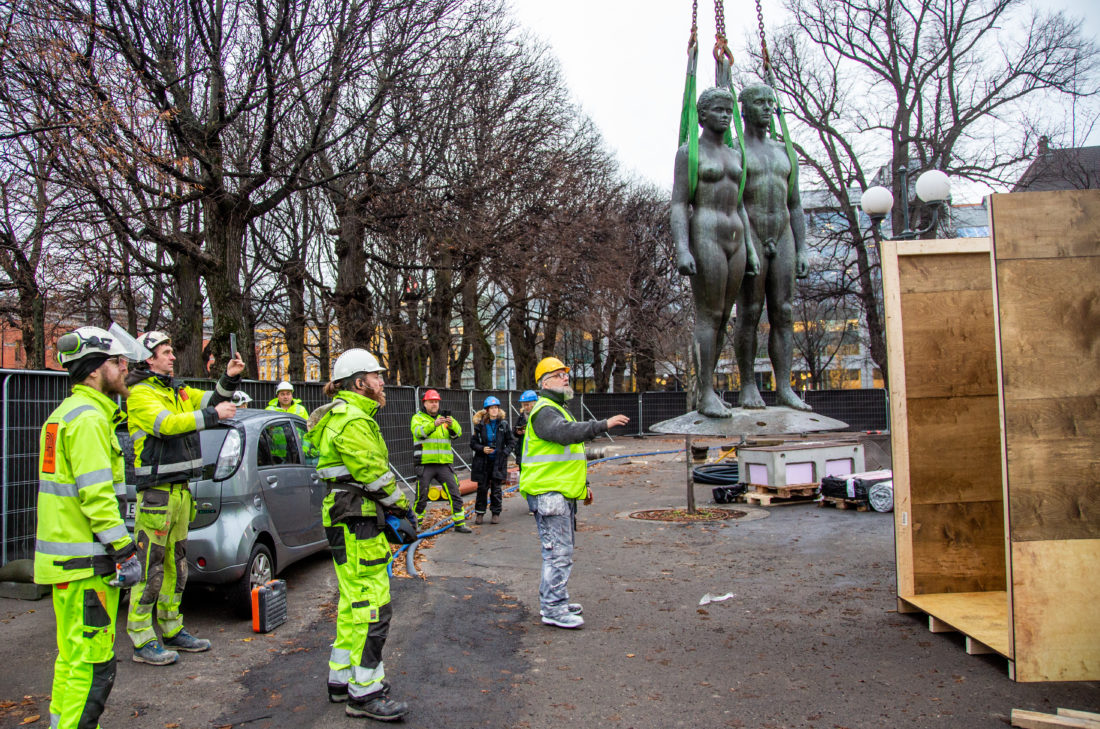 KJØRES BORT: Bronseskulpturen skal nå stå på lager i Asker fram til sommeren, når den på ny skal pryde toppen av granittsøylen. (Foto: Runar F. Daler).