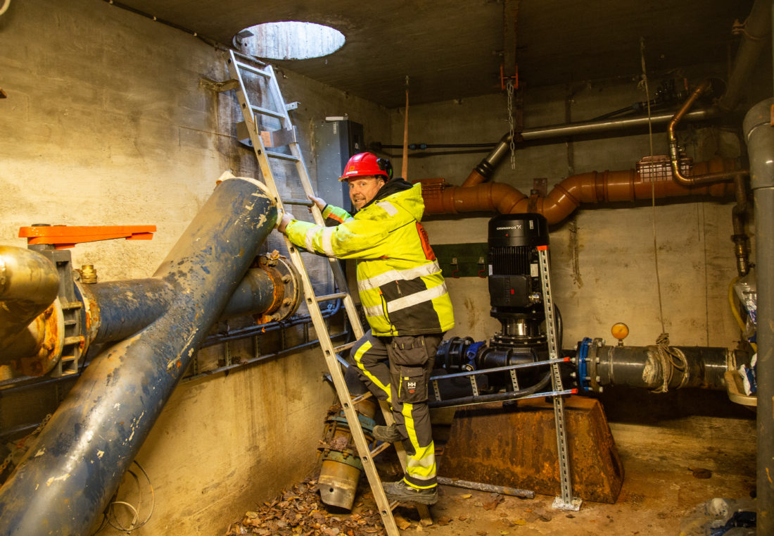UNDER BAKKEN: Teknisk rom, som befinner seg under bakken, har vært fylt med sjøvann etter springflo. Rommet inneholder bl.a. et vannbasseng, pumper, filtre, rør og komponenter, og det meste skal byttes ut, forteller anleggsleder Svein Kildal. (Foto: Runar F. Daler).