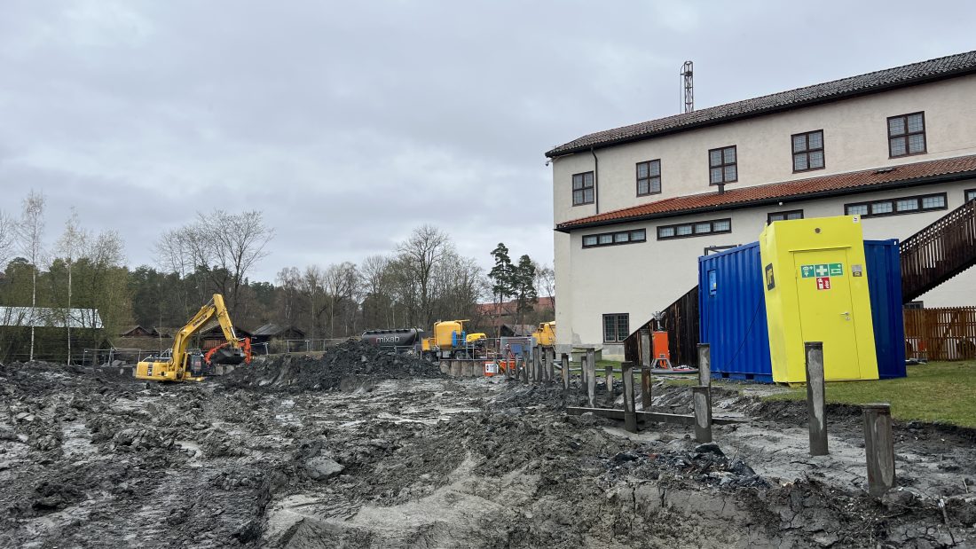 Det er krevende arbeidsforhold på det nye Vikingstidsmuseet på Bygdøy på grunn av kvikkleiregrunn. AF-gruppen forventer å måtte sette ned over 10.000 kalksementpeler for å stabilisere grunnen. (Foto: Linda Grønstad/Statens vegvesen)