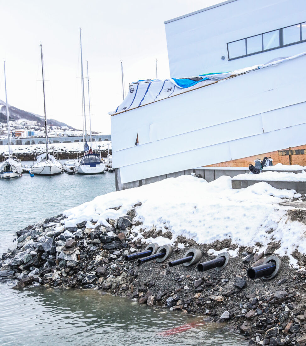 – Akkurat nå holder vi på med vann og avløp, og den nye sjøvannsledningen inn til bassenget. I tillegg legger vi inn strøm og gjør litt overflatearbeid på utsiden av nybygget. Bygget er som nevnt fundamentert på peler, både for bæring av selve bygget og for å hindre oppdrift av bassenget. Vi benyttet 10-12 meter lange stålpeler, som ble boret gjennom løsmasser og gyst fast mellom tre og fire meter ned i fjell, forklarer han.
